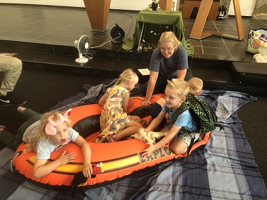 De kinderen mogen ook allemaal even in de opblaasboot die in de kerk ligt. Vervolgens gaat de wind hard waaien, in de kerk voelen we dat bij de ventilator. Als het zo stormt dan zegt Jona dat het zijn schuld is. De andere mensen moeten hem in het water gooien. Gelukkig komt er een walvis die hem inslikt en op het strand weer uitspuugt.